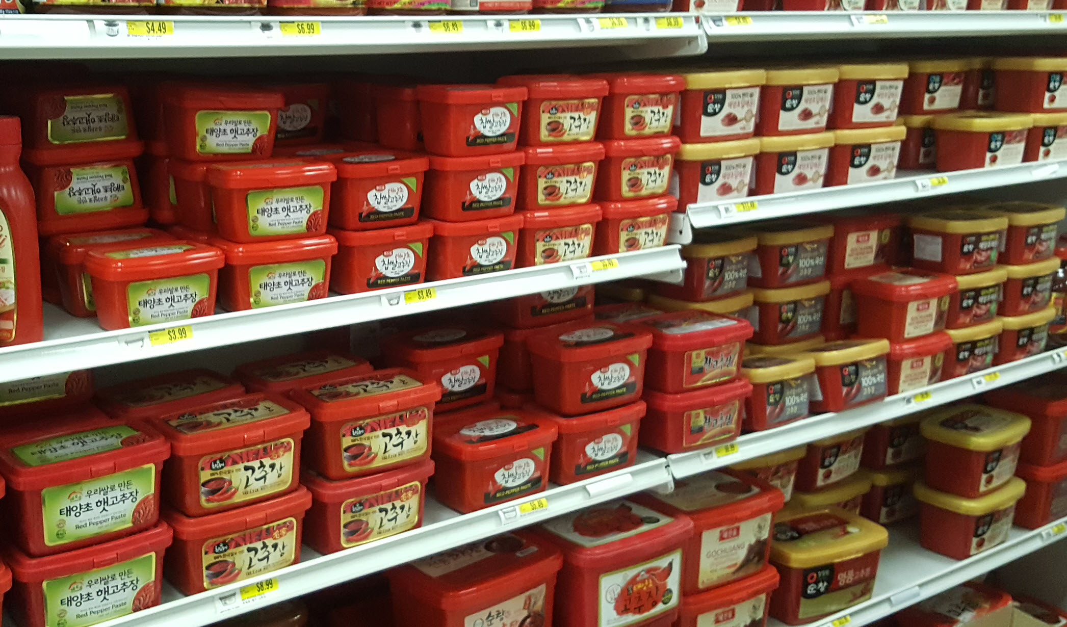 This fermented staple Korean ingredient adds spiciness and sweetness to many dishes. Pronounced Gochujang in Korean, but sometimes labeled as “red pepper paste” or “hot pepper paste” on the package. Keep in the fridge after opening.